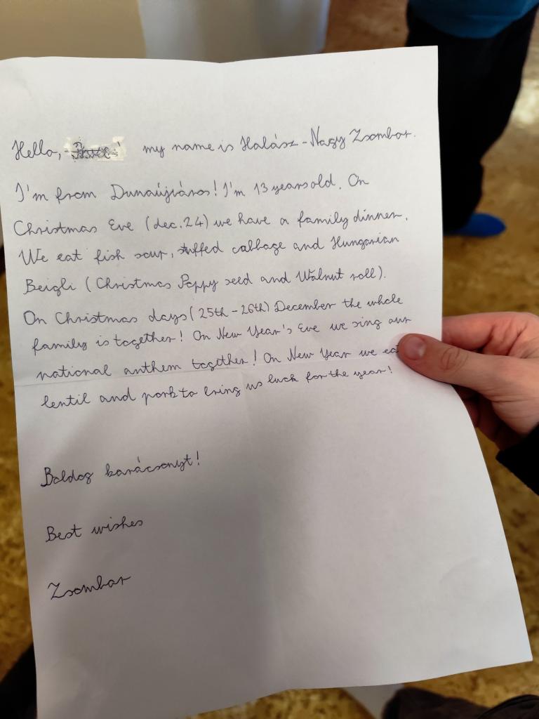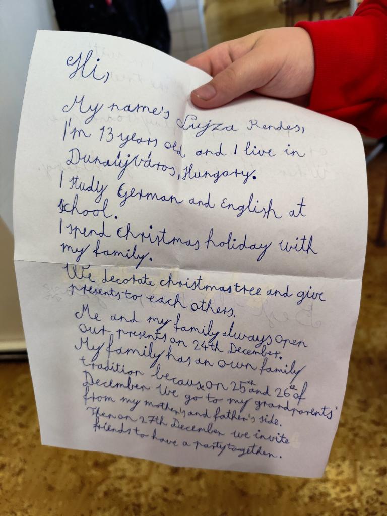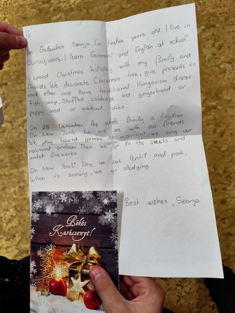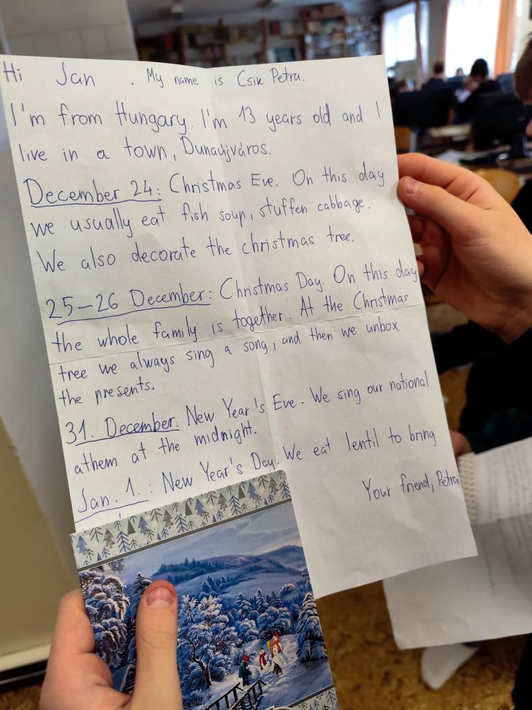 Není nad to vyzkoušet si své znalosti v praxi. Napsat něco o sobě v anglickém jazyce, včetně vánočního přání, zároveň nakreslit obrázek na počítači a celé to zkompletovat do obálky, to byl úkol 5.H. Takto hotová přání jsme poslali poštou pro děti do školy v Maďarsku, od kterých jsme také obdržely krásná vánoční přání. Na obou stranách byla velká radost z výměny :)