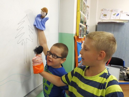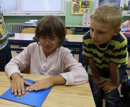 Fotografie žáků při práci s novými pomůckami: