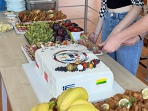 Večer jsme to roztočili zase ve škole. Při neformálním uvítacím rautu došlo i na tanec, trdlování, hopsání, kroucení… Řekové zachránili zpočátku lehce rozpačitý večer svým tradičním tancem, ale pak už to svištělo! Moc děkujeme Aničce za skvělý dort s logem projektu.
